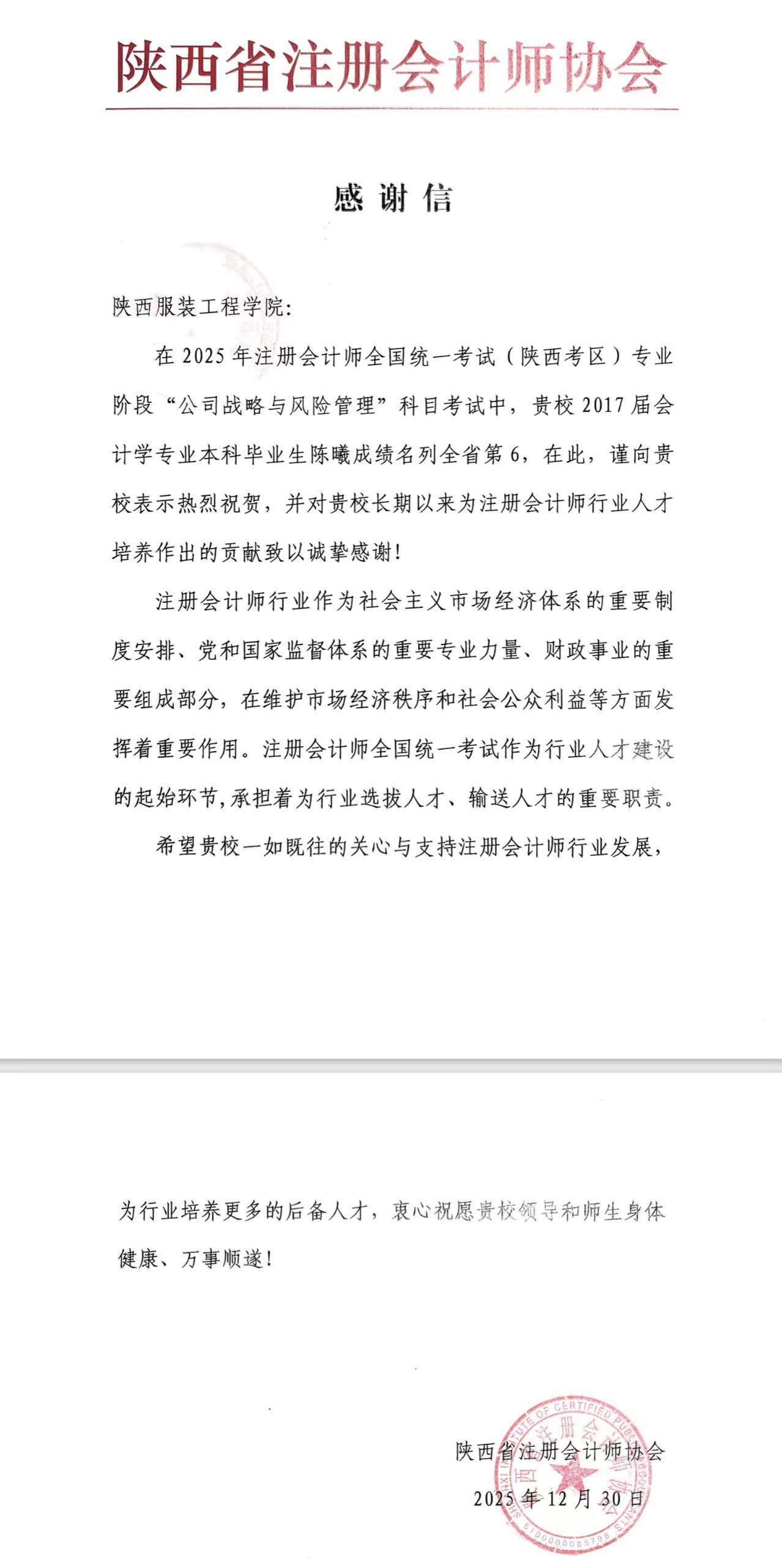 (经济管理学院)近日,陕西省注册会计师协会向我校发来感谢信,对2017届会计学专业本科毕业生陈曦在2025年注册会计师全国统一考试(陕西考区)专业阶段“公司战略与风险管理”科目中取得全省第6名的优异成绩表示热烈祝贺,并对我校长期以来为注册会计师行业人才培养作出的贡献致以诚挚感谢。