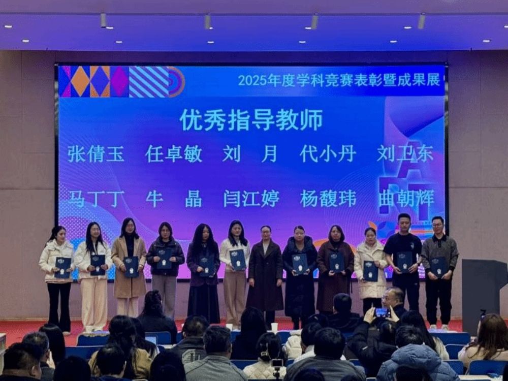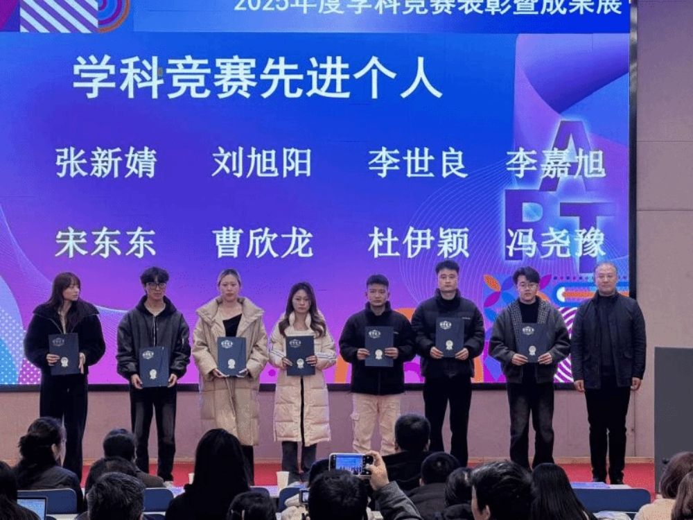 艺术设计学院副院长任晓丽宣读《关于表彰2025年度学科竞赛表现突出先进个人的决定》。获奖教师与学生依序步入领奖台,学校及学院领导为其颁发荣誉证书,并一同合影留念,将这一属于艺术设计学院的荣耀时刻予以定格。