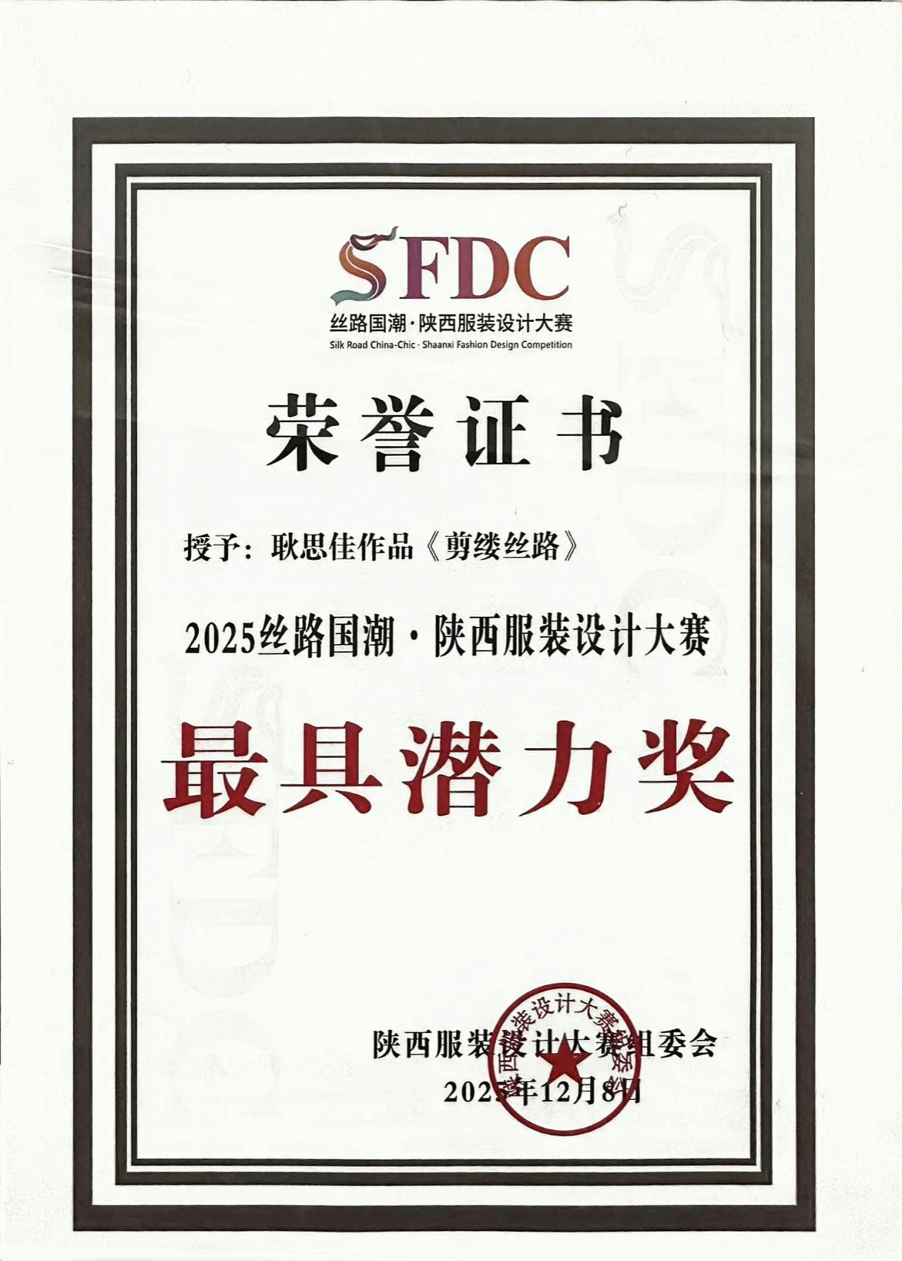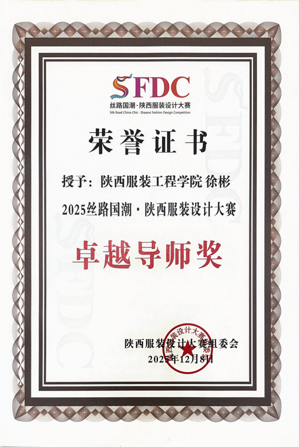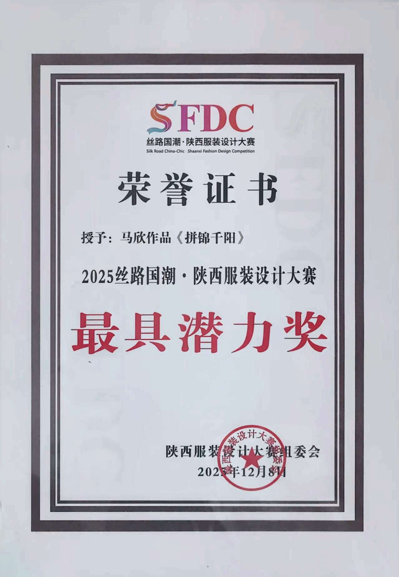 总决赛上,我校入围决赛的4组作品凭借独特的设计理念和地域文化特色脱颖而出,孙铭麒和范超的作品《秦韵丹霞·时空共生》获本次赛事唯一的金奖,马欣作品《拼锦千阳》、张思源作品《布履生花》、耿思佳作品《剪缕丝路》获最具潜力奖。服装学院院长张莉获匠心传承奖,服装学院执行院长徐彬、副院长刘红获卓越导师奖,学校获最佳组织奖。师生们在赛事上的的优秀表现充分展现了我校服装学院专业水准与课程改革成果。这不仅是对我校师生专业能力与创作水平的充分肯定,更是我校深耕服装与服饰设计专业人才培养、融合地域文化与现代设计理念、强化产教融合与实践育人成果的生动体现。